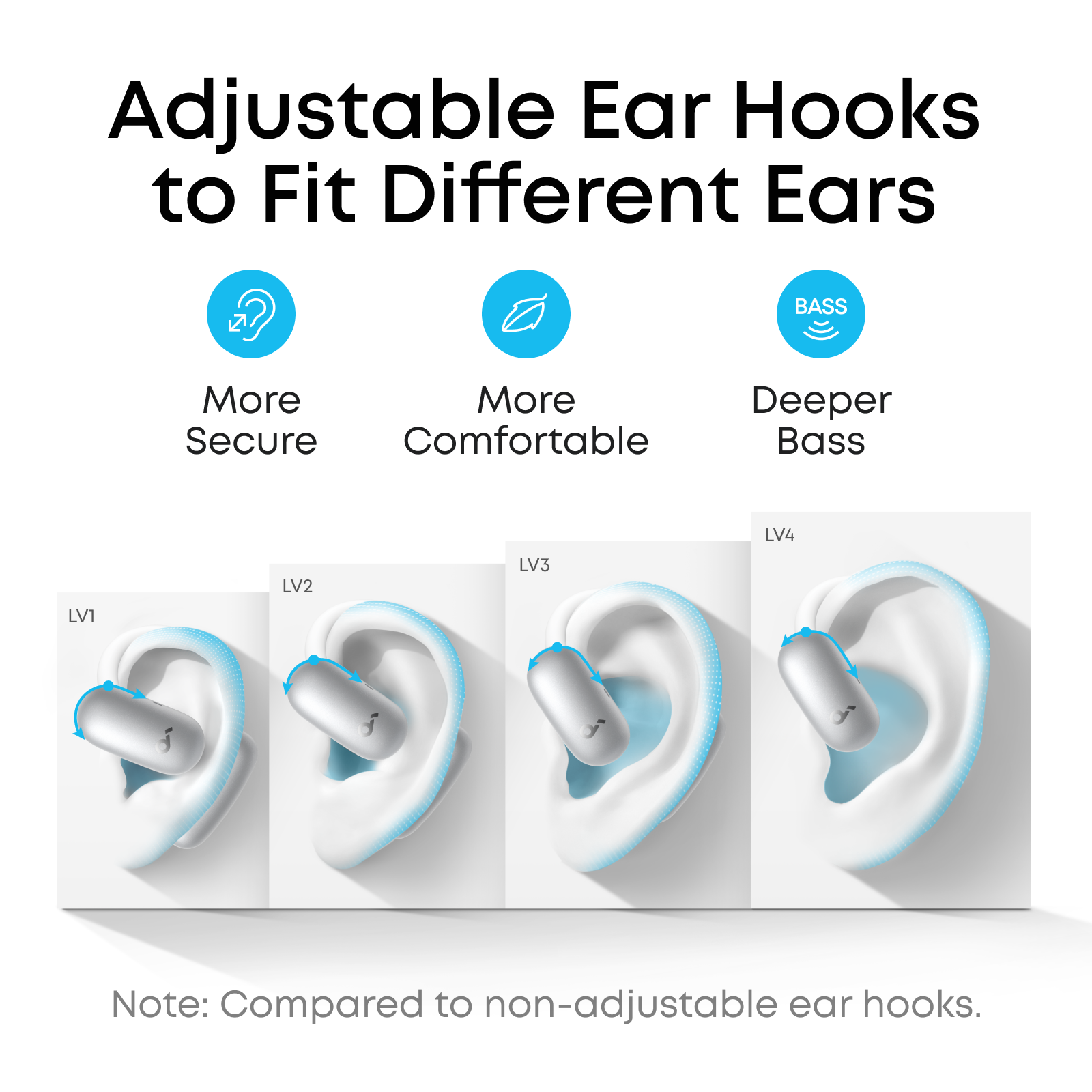 Pressure-Free Fit for Every Ear: Double-curved surface and soundcore's innovative 4-level adjustable ear hooks ensure a pressure-free fit tailored to over 99% of ear shapes and sizes.