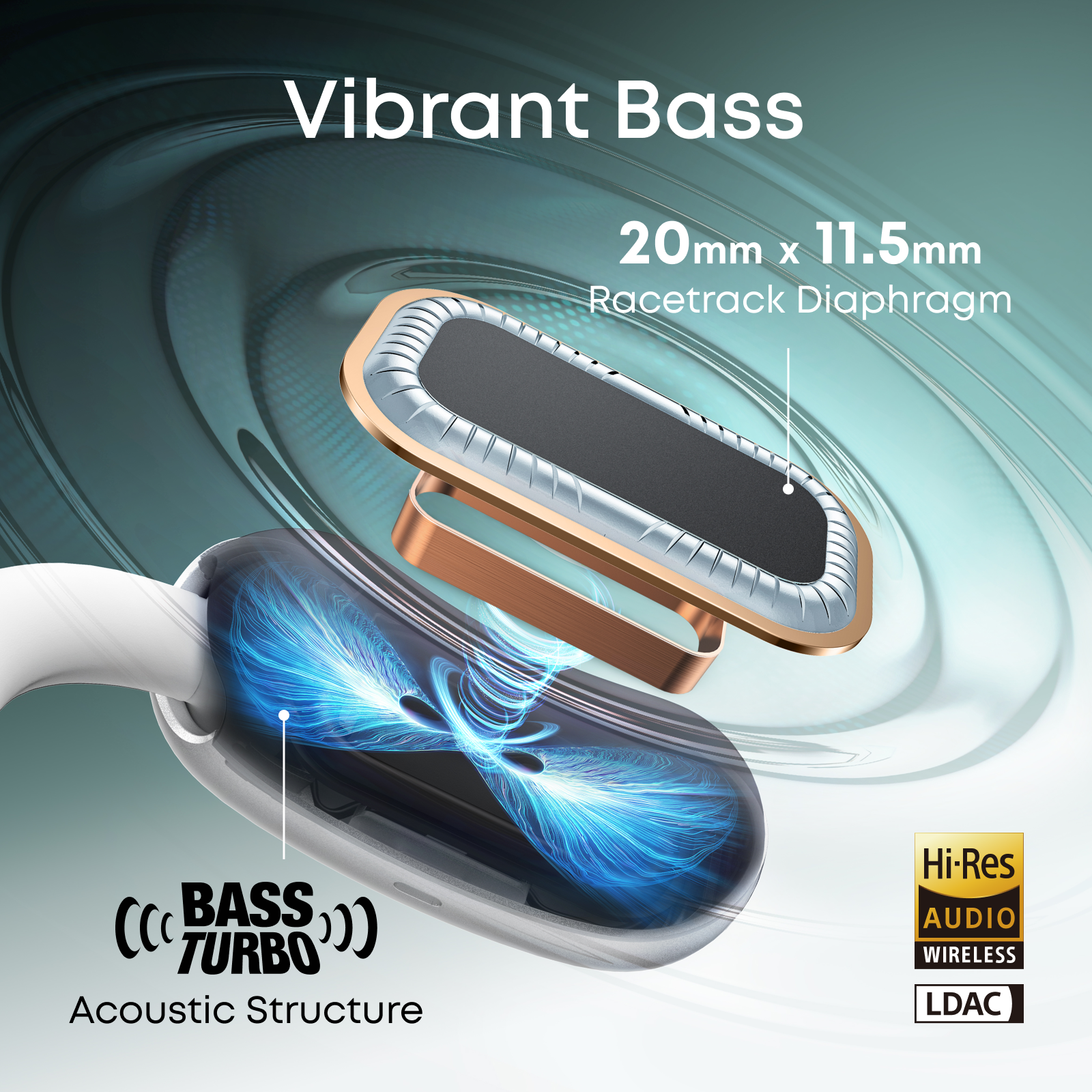 Vibrant Bass: Enjoy deep bass fueled by 20 mm × 11.5 mm racetrack drivers and BassTurbo acoustics. With Bluetooth 5.4 and LDAC support, experience stable, high-resolution audio transmission.