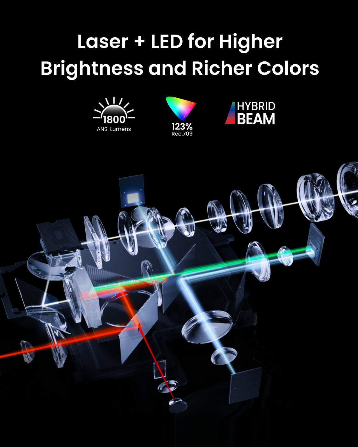 HybridBeam Technology for High Brightness: Our all-new HybridBeam technology combines LED and laser light sources to deliver 1,800 ANSI Lumens of brightness and 1.07 billion rich colors.